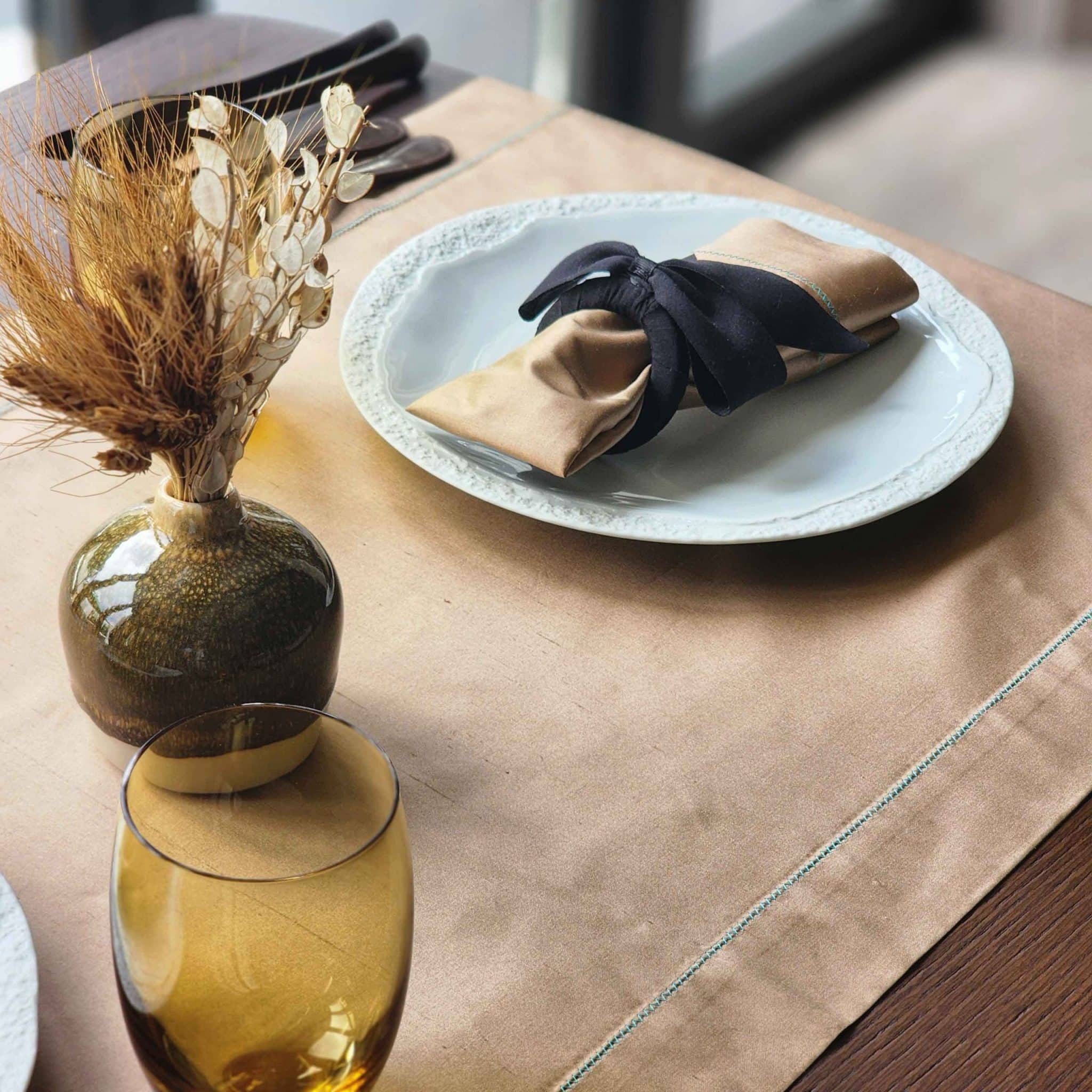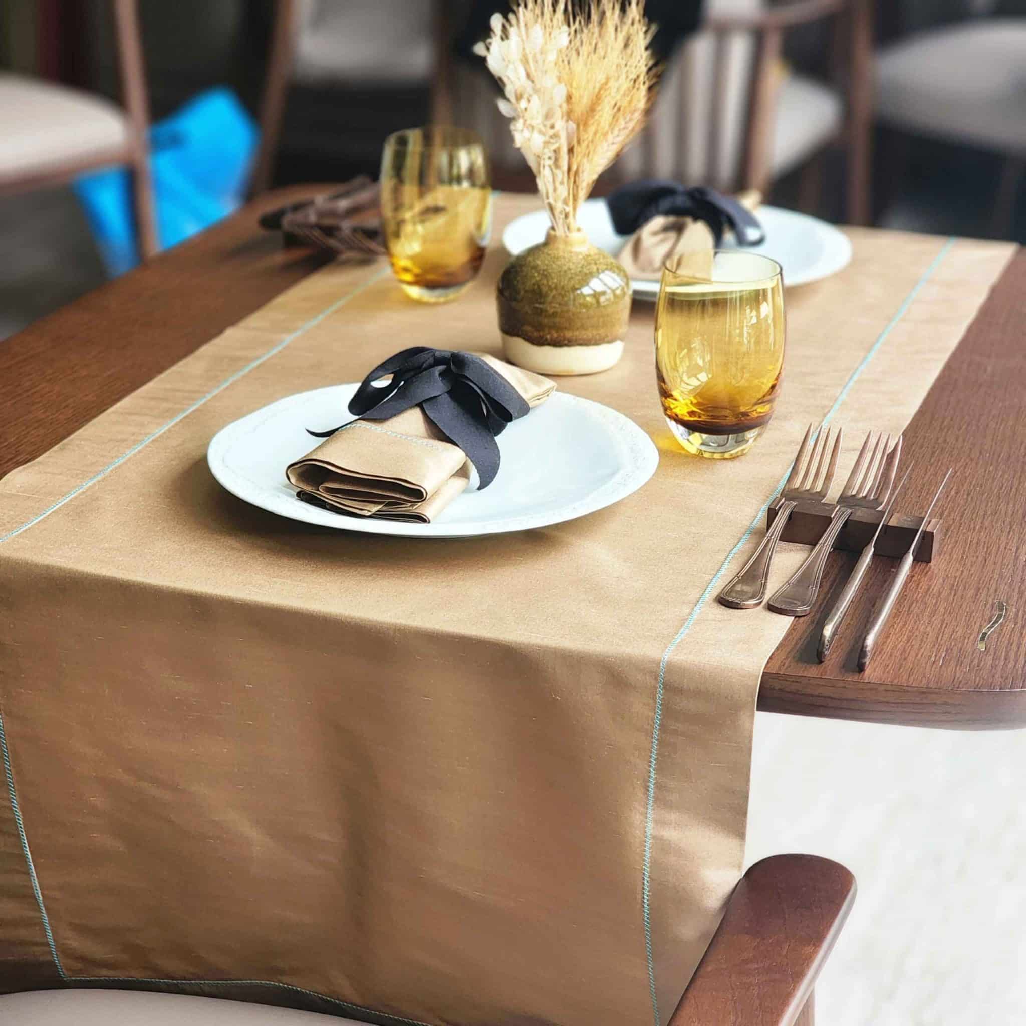 Sofralarınızda zarafetin ve modern detayların buluştuğu bu özel runner, Alesta Home’un şıklıkla işlevselliği bir araya getiren koleksiyonundan. Açık kahve rengindeki ipek kumaş, doğal ışıltısıyla masanıza sofistike bir dokunuş katarken, kenarlarında kullanılan turkuaz zigzag dikiş detayları çağdaş ve zarif bir kontrast yaratır. İnce yapısı ve dökümlü formu sayesinde masa üzerinde kusursuz bir duruş sergiler.