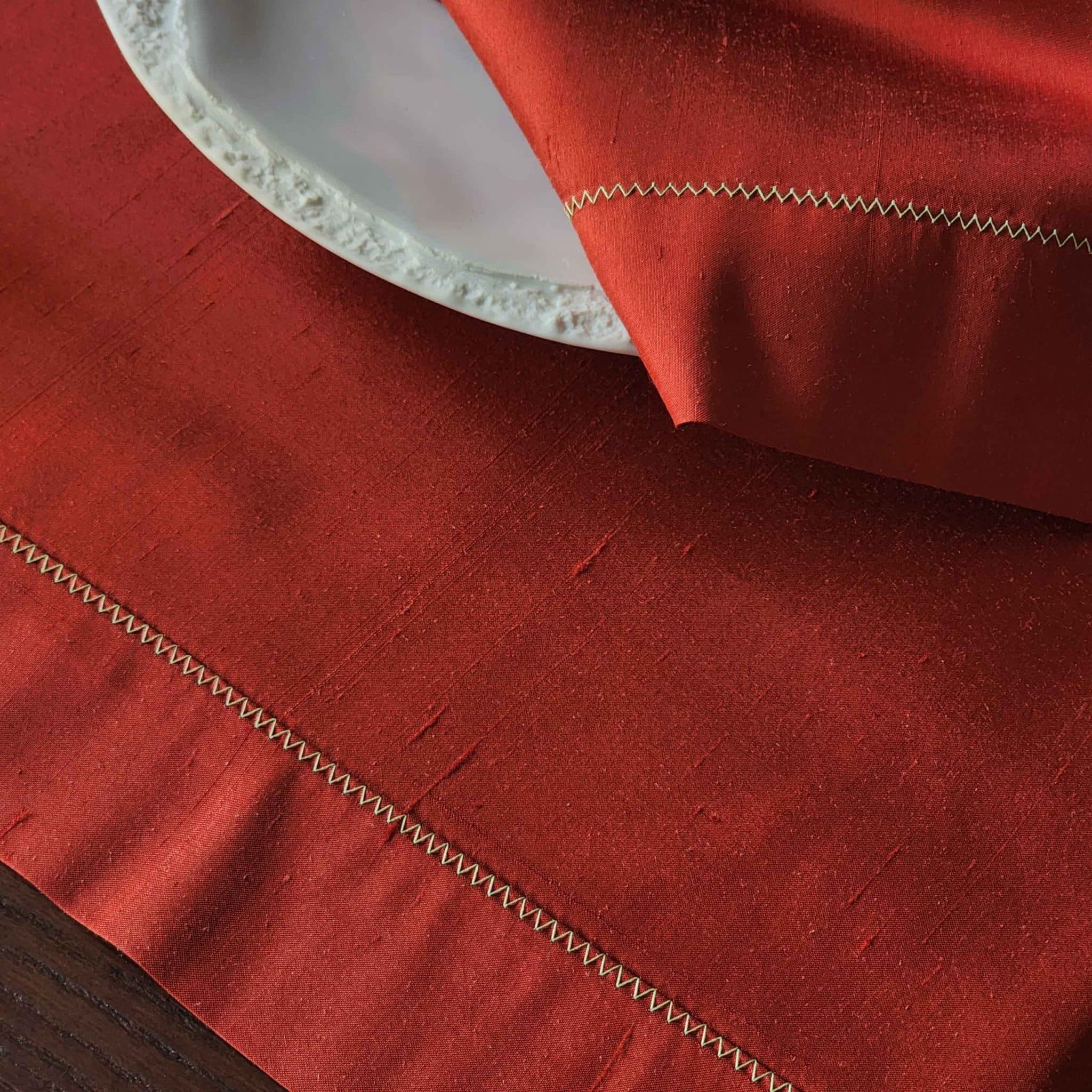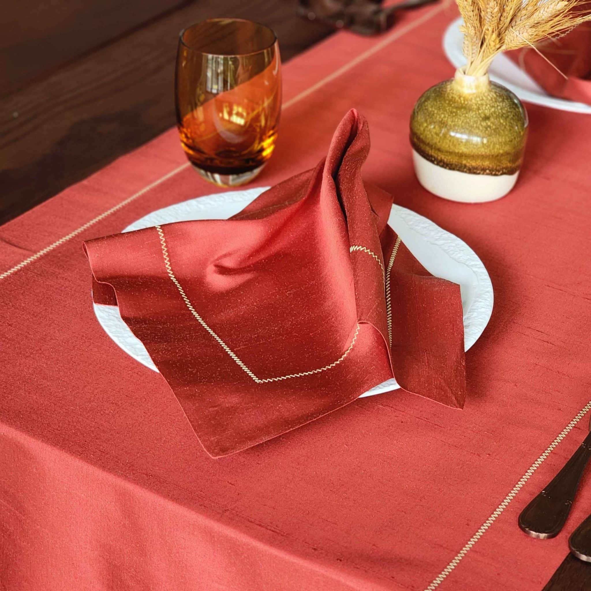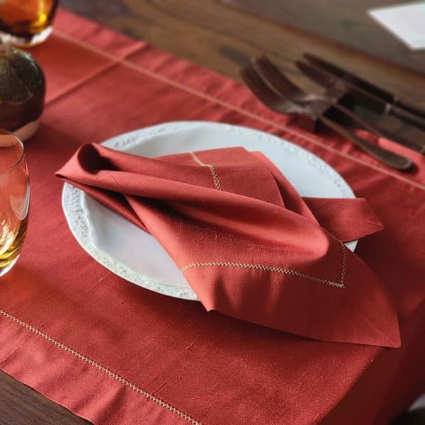 Zengin kiremit tonunun asaletiyle buluşan bu ipek peçete, sofralarınıza zarafet ve derinlik katmak için özel olarak tasarlandı. %100 ipek kumaştan üretilen bu ürün, doğal ışıltısı ve dökümlü yapısıyla göz kamaştırırken, kenarlarında yer alan ince sarı zigzag dikiş detayıyla modern bir dokunuş sunar. Lüks masa düzenlemelerinde fark yaratmak isteyenler için ideal bir tercih.
